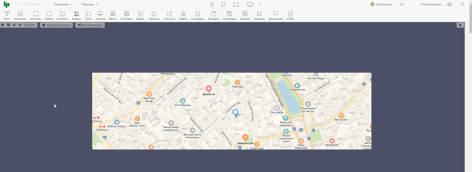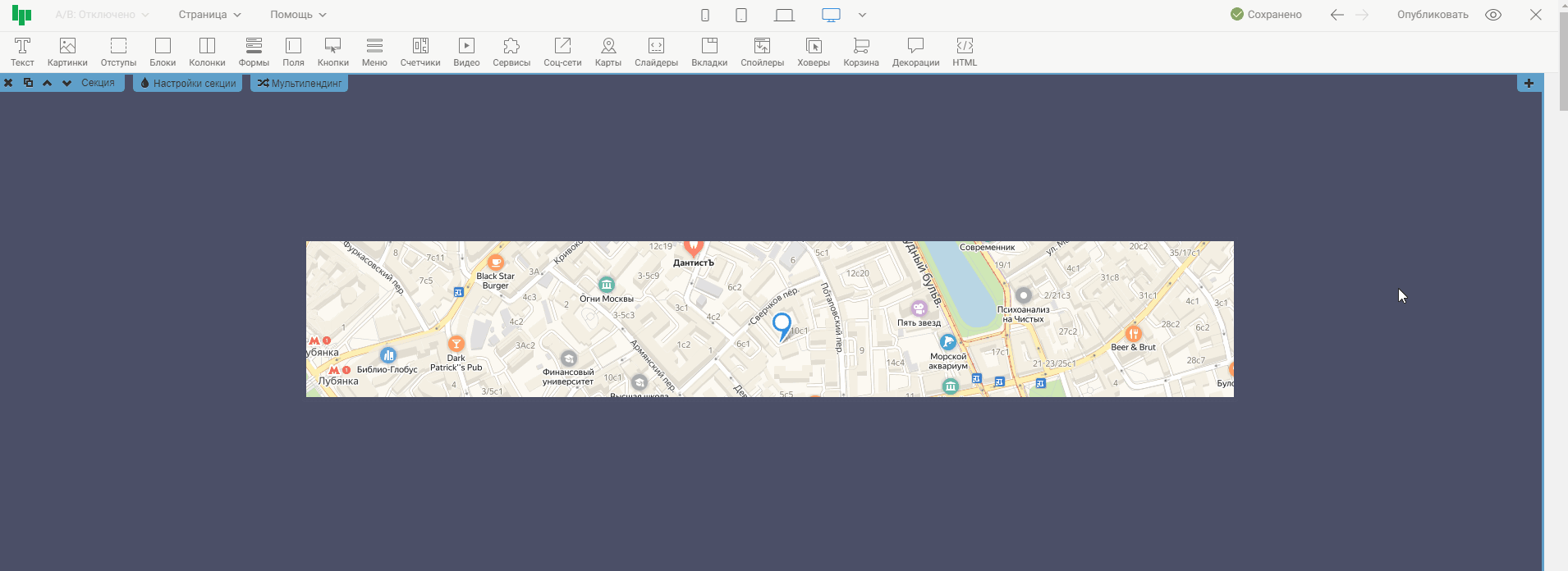 На Платформе есть несколько вариантов, как добавить карту на страницу. Можно добавить целую готовую секцию «Карта» или же использовать точечно виджет. Рассмотрим ниже оба варианта.