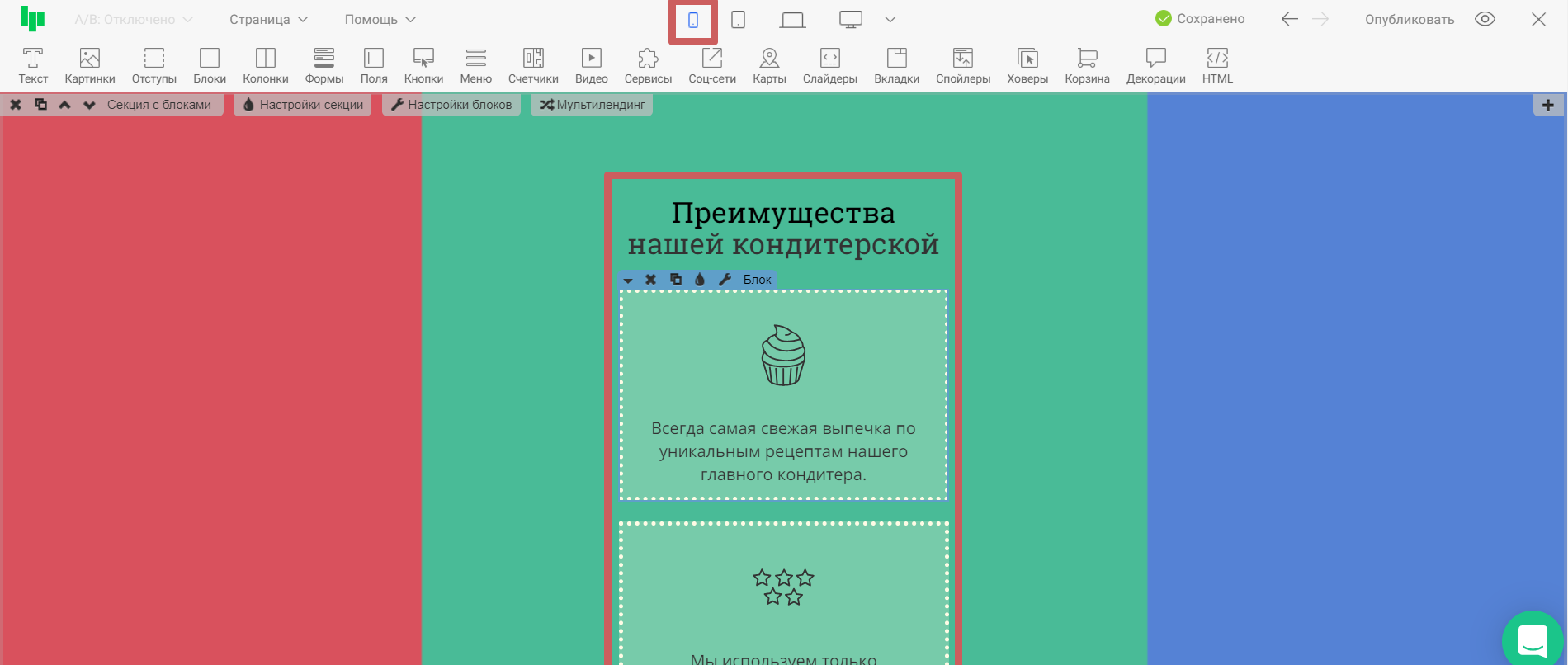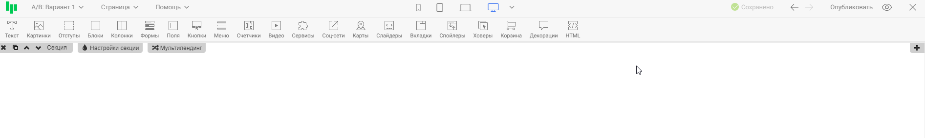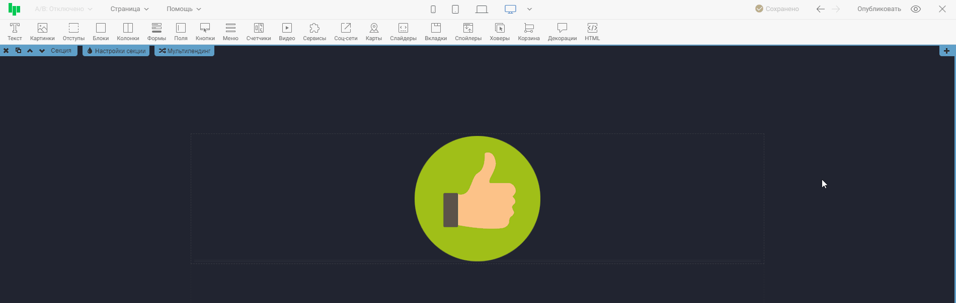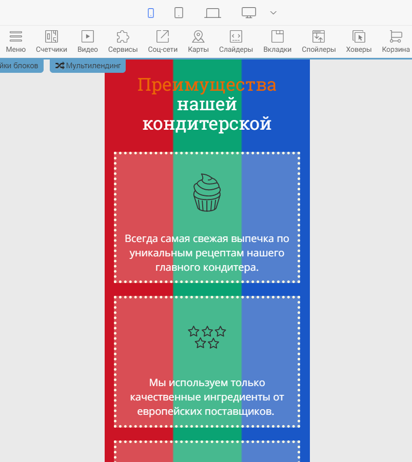Нажав на иконку одного из устройств, контент в редакторе выстроиться так, как будет отображаться страница на этом устройстве. Тем самым, вы сможете оценить, насколько корректно страница отображается на выбранном устройстве, и внести правки, если понадобится. На примере ниже проверим отображение страницы на широкоформатных экранах и на мобильных телефонах.