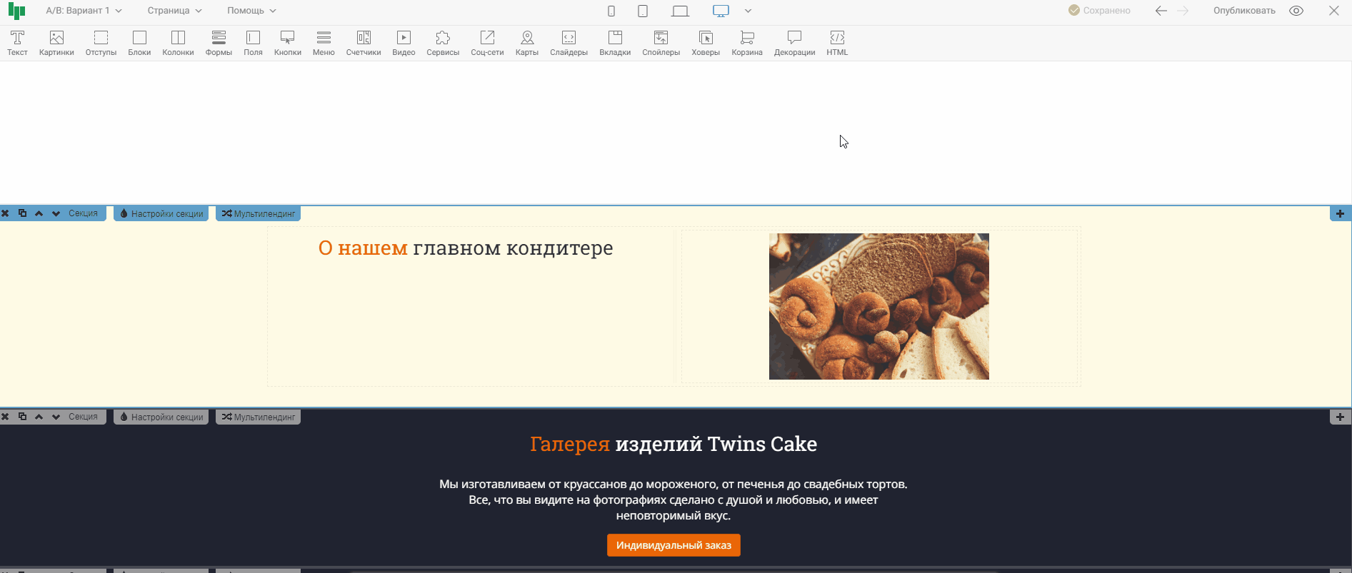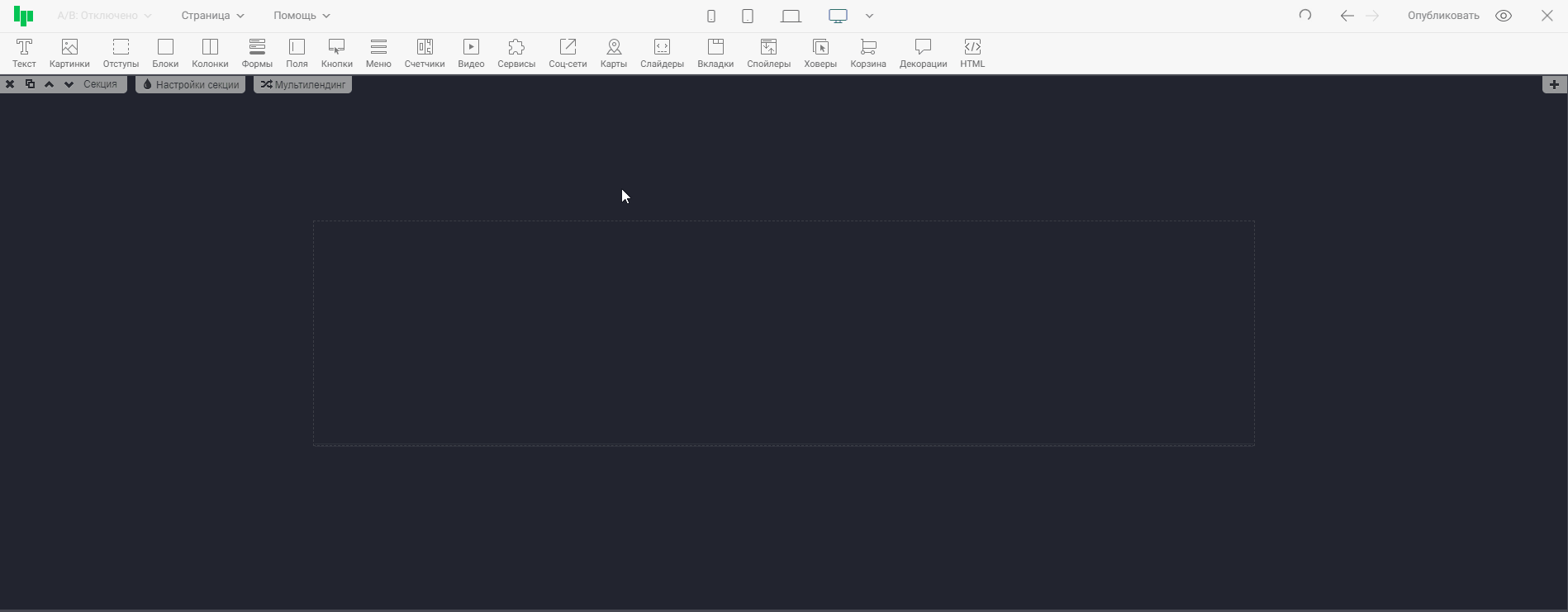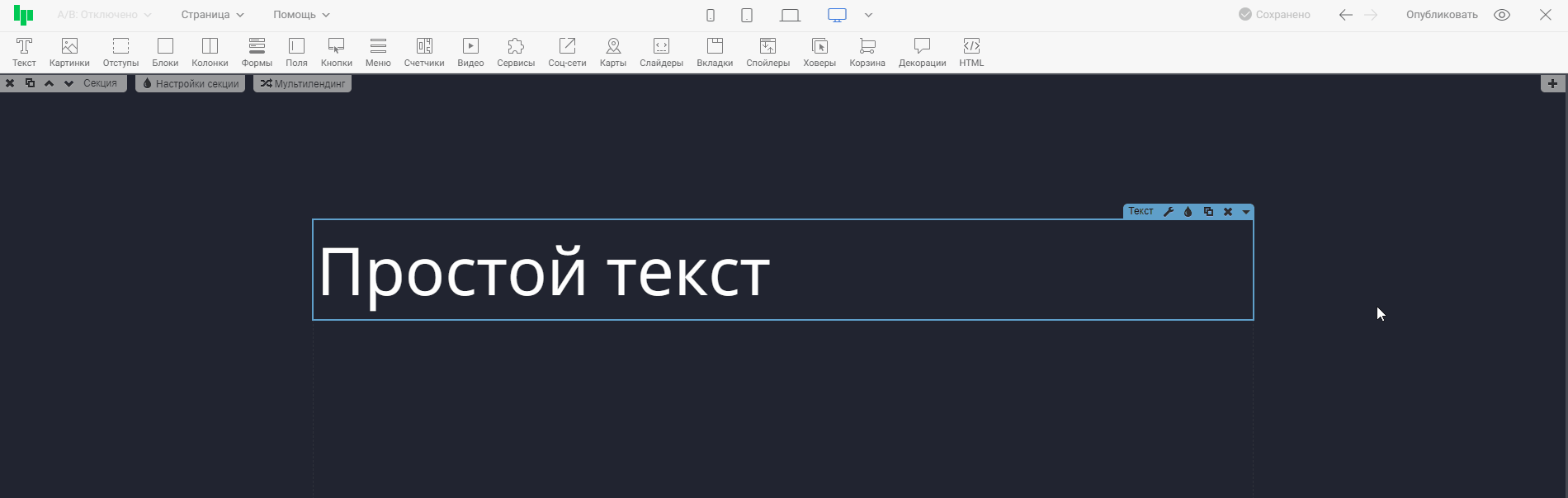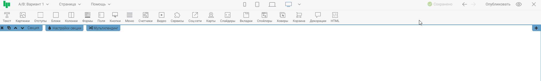Нажав на иконку одного из устройств, контент в редакторе выстроиться так, как будет отображаться страница на этом устройстве. Тем самым, вы сможете оценить, насколько корректно страница отображается на выбранном устройстве, и внести правки, если понадобится. На примере ниже проверим отображение страницы на широкоформатных экранах и на мобильных телефонах.