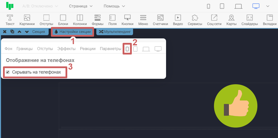 Также мы можем скрыть отображение этой секции для конкретного устройства. Более подробно мы разберем эту функцию в разделе «Как скрыть виджет или секцию от конкретного устройства? »