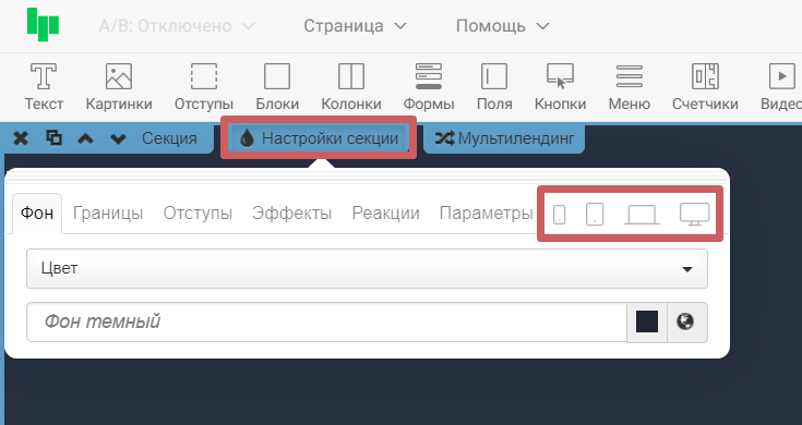 В настройках стилей секции (иконка капельки) мы имеем общие настройки адаптации, которые одинаковы на всех секциях. Для этого зайдите в настройки стилей секции и нажмите на иконку устройства, для которого хотите ее адаптировать: