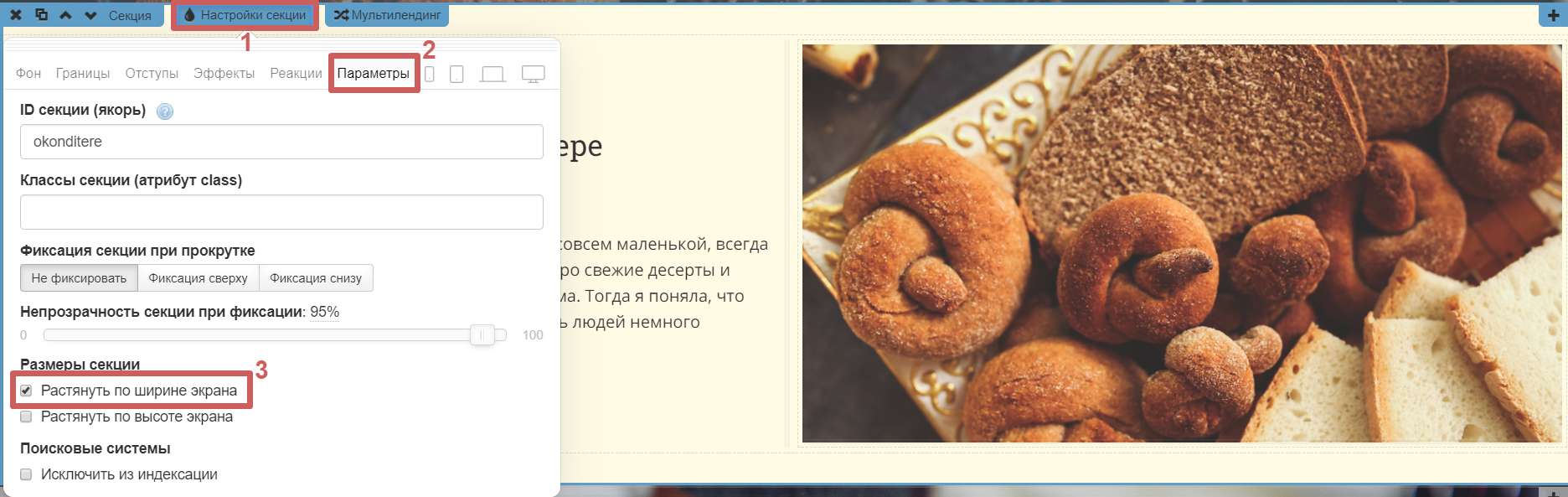 ❗Обратите внимание, что если включить на секции функцию «Растянуть по ширине экрана», то в редакторе, при переходе между устройствами, контент в секции будет оставаться на месте и не будет подстраиваться под экран, как показано на примере выше.