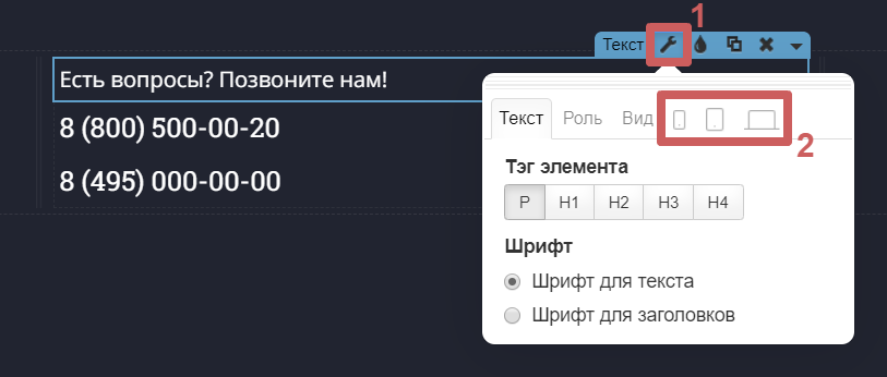 В этих настройках у разных виджетов могут быть разные функции. Например, в виджете текста, можно сделать шрифт меньшего размера, если посетитель зашел с мобильного, а у виджета кнопки изменить ее положение.