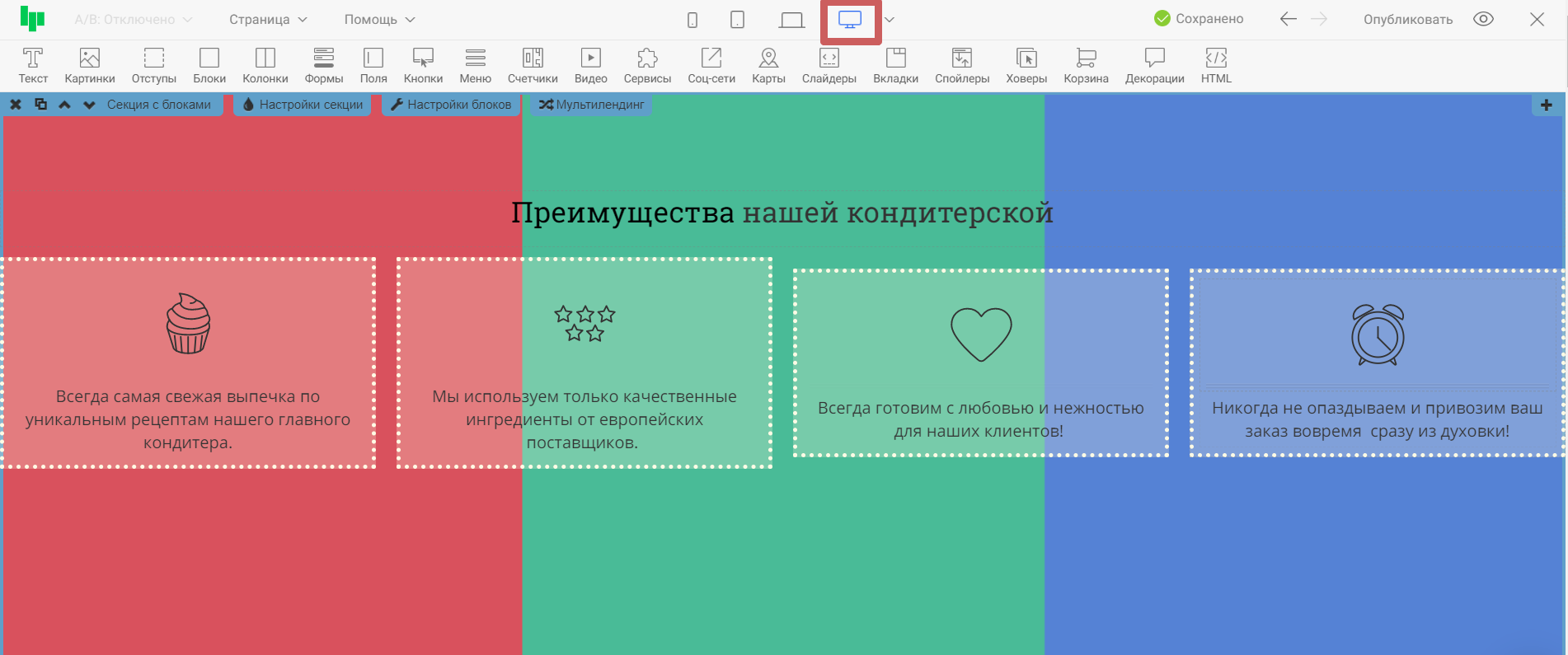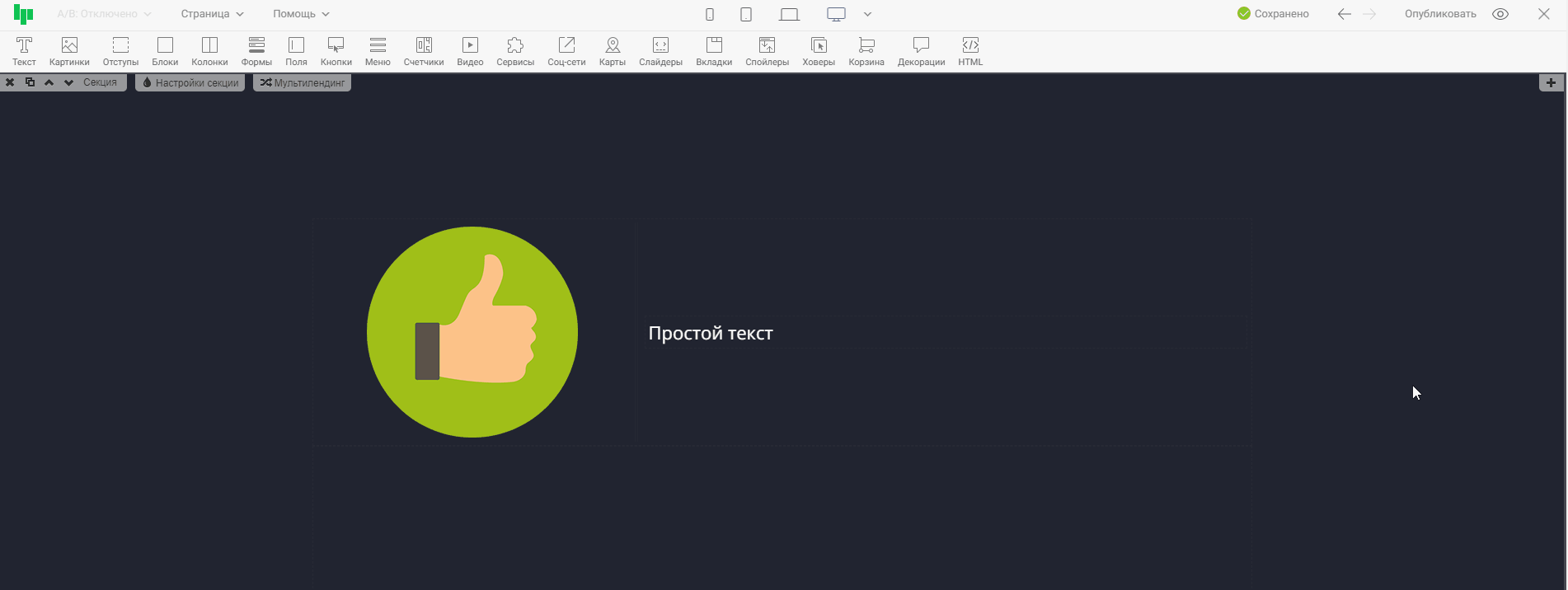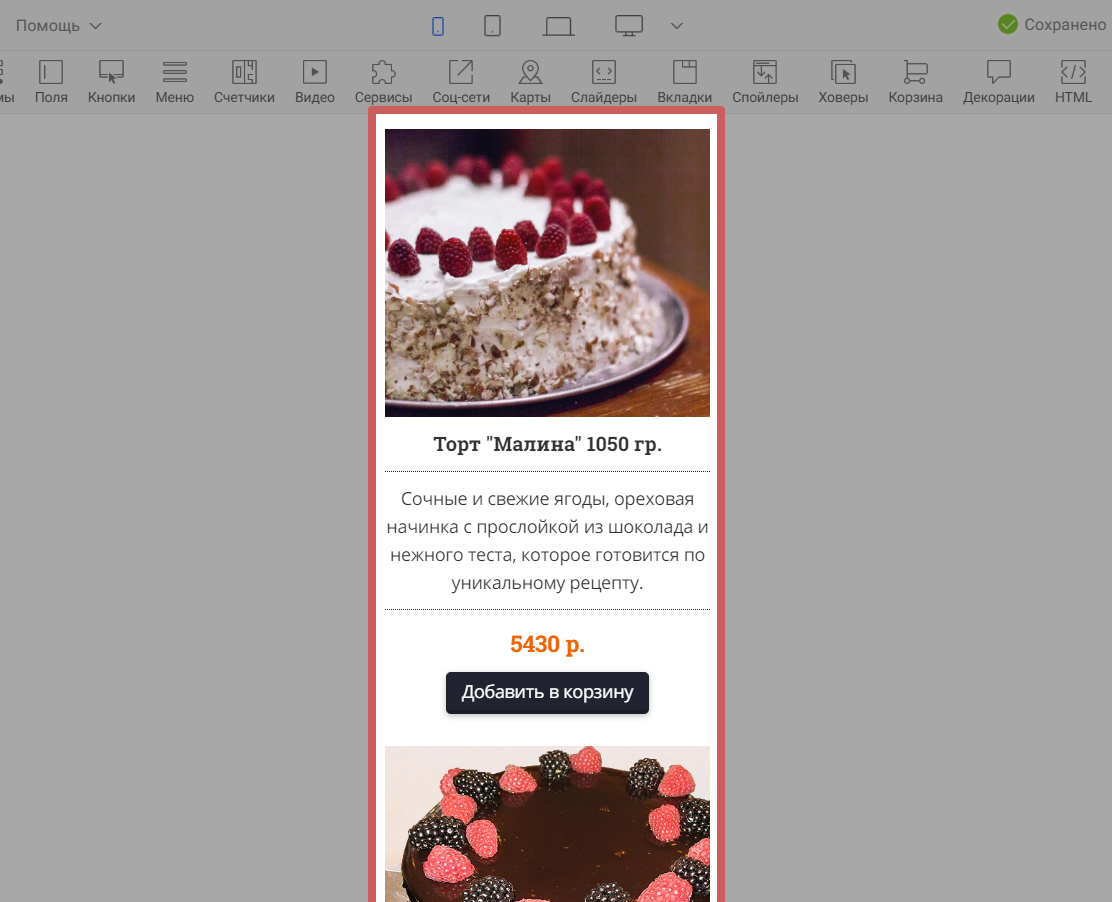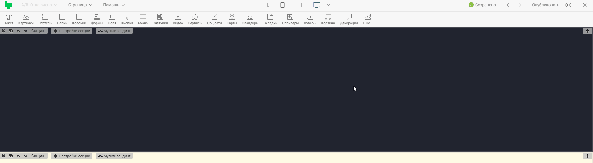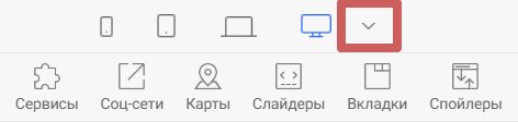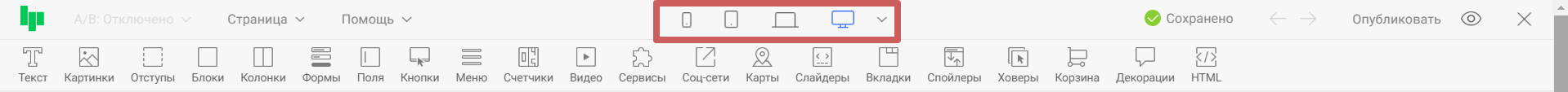 Нажав на иконку одного из устройств, контент в редакторе выстроиться так, как будет отображаться страница на этом устройстве. Тем самым, вы сможете оценить, насколько корректно страница отображается на выбранном устройстве, и внести правки, если понадобится. На примере ниже проверим отображение страницы на широкоформатных экранах и на мобильных телефонах.