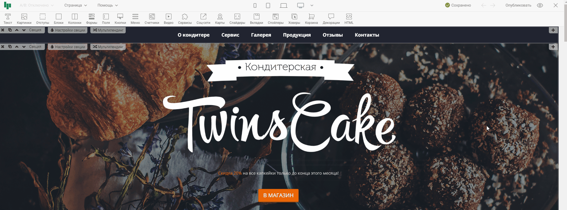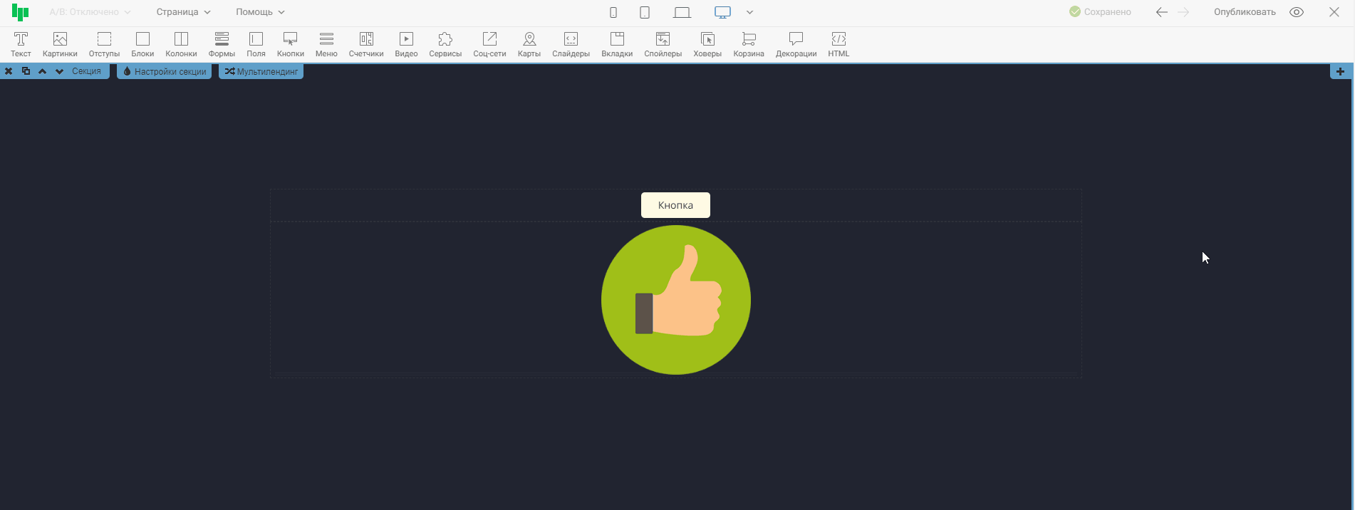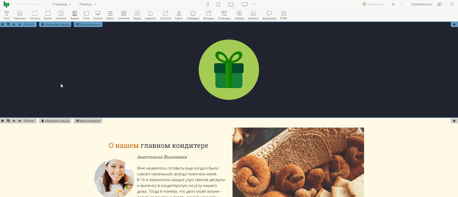 Нажав на иконку одного из устройств, контент в редакторе выстроиться так, как будет отображаться страница на этом устройстве. Тем самым, вы сможете оценить, насколько корректно страница отображается на выбранном устройстве, и внести правки, если понадобится. На примере ниже проверим отображение страницы на широкоформатных экранах и на мобильных телефонах.