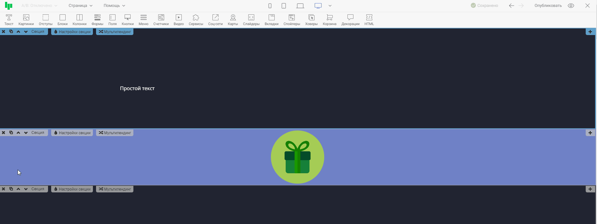 ❗ Информация, что виджет или секция скрыты на конкретном устройстве (в виде текста), отображается только в редакторе. В предпросмотре или на опубликованной странице, если зайти на нее по ссылке, этот текст отображаться не будет.