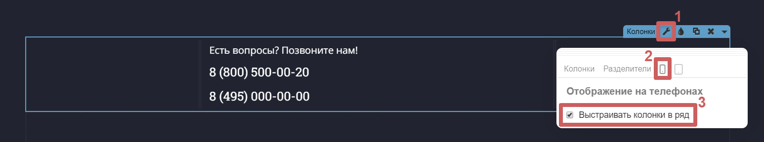 Включить и выключить отображение колонок по вертикали на мобильных устройствах можно в настройках виджета (гаечный ключ) → нажать на иконку мобильного → включить или отключить функцию «Выстраивать колонки в ряд». Эту функцию также можно активировать или деактивировать для планшетов.