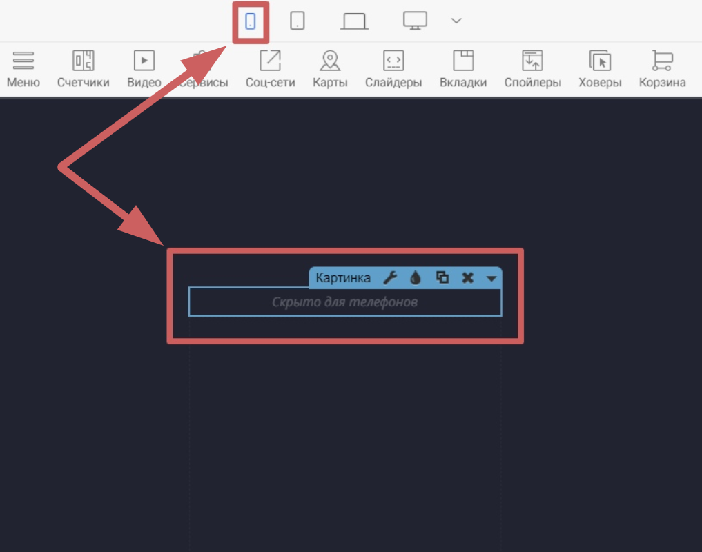 Чтобы содержимое скрытого виджета или секции снова начали отображаться в редакторе - перейдите в просмотр того устройства, от которого они не скрыты, или отключите скрытие. Например, если виджет скрыт на мобильных - его содержимое будет отображаться на всех форматах в редакторе, кроме мобильного.