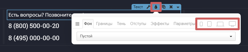 В настройках стилей секции (иконка капельки) мы имеем общие настройки адаптации, которые одинаковы на всех секциях. Для этого зайдите в настройки стилей секции и нажмите на иконку устройства, для которого хотите ее адаптировать:
