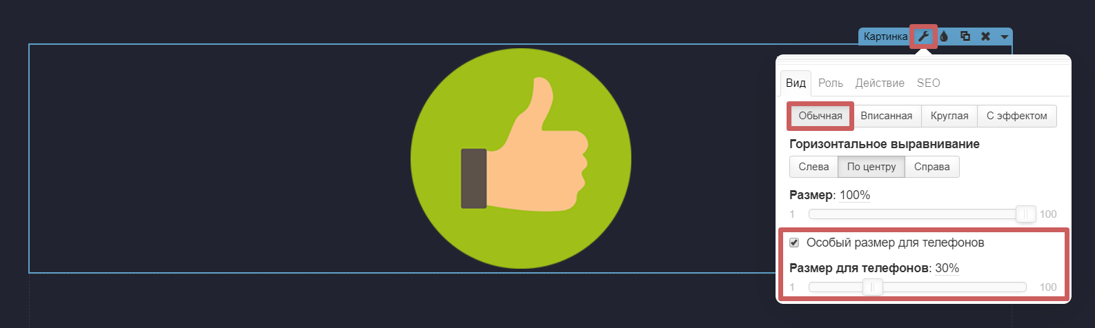 В виджете «Картинка» можно задать особый размер картинки для мобильных устройств. Например, если на мобильных картинка получается слишком большой, но если сделать ее меньше, на других устройствах станет слишком маленькой - можно воспользоваться этой функцией, чтобы уменьшить ее только для мобильных, а для остальных устройств оставить прежнего размера.