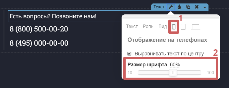 В этих настройках у разных виджетов могут быть разные функции. Например, в виджете текста, можно сделать шрифт меньшего размера, если посетитель зашел с мобильного, а у виджета кнопки изменить ее положение.