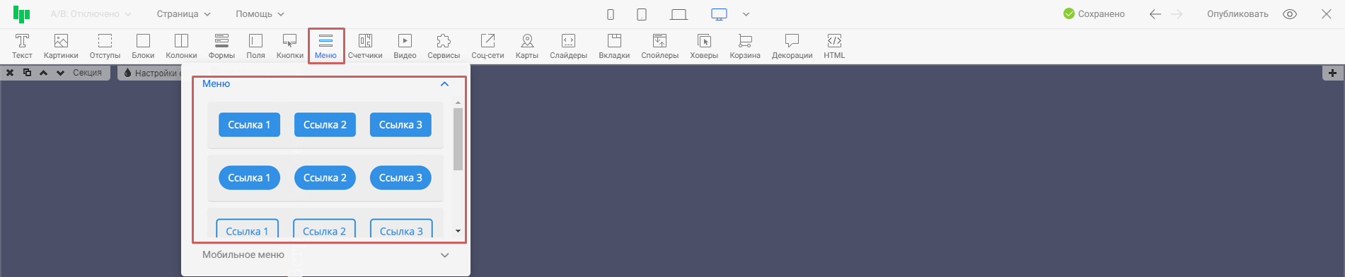 ➢Также вместо секции мы можем добавить виджет «Меню » с верхней панели редактора, если хотим установить меню внутрь уже созданной секции.
