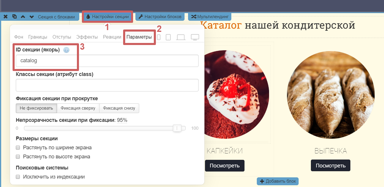 На примере ниже, установим название якоря catalog в настройках секции, в разделе «Параметры »