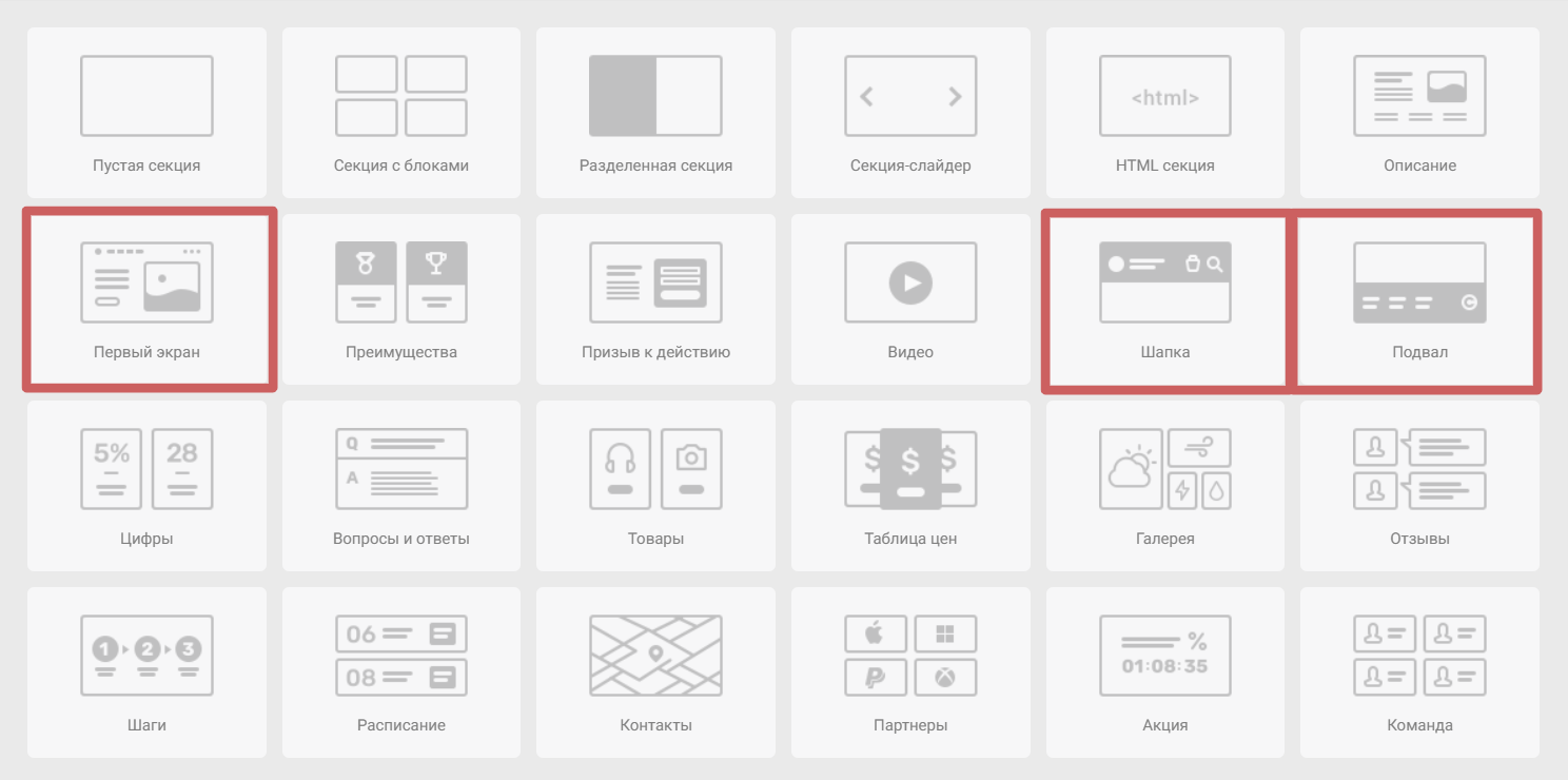➢На страницу можно добавить шаблонную секцию, в которой уже находится виджет «Меню». К таким секциям относятся: