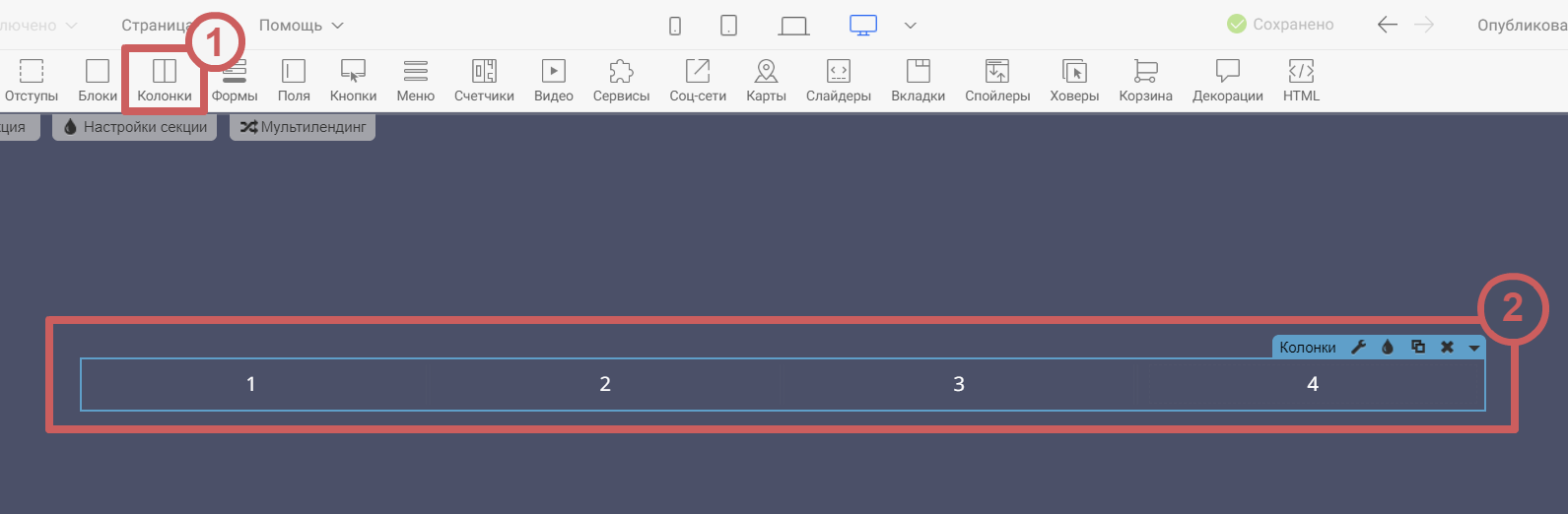 1. Добавляем на страницу виджет «Колонки ». Количество колонок будет равняться количеству кнопок. Т.е. если вам нужно добавить 4 кнопки для навигации - добавьте колонку, разделенную на 4 части.