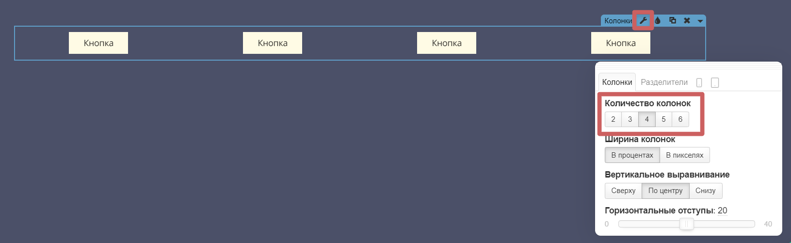 3. В настройках виджета «Колонки » мы можем изменить количество колонок. Например, если нам понадобится добавить еще несколько кнопок