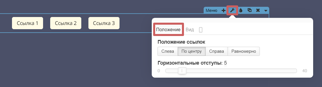1. Положение ссылок. Здесь можно выбрать положение кнопок на странице. Например, если выбрать положение «Слева» - все кнопки переместятся в левую часть страницы. Рассмотрим на примере: