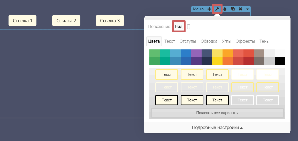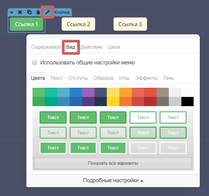 Здесь мы можем настроить внешний вид кнопок. Все изменения будут применяться на всех кнопках, которые находятся внутри виджета меню. Если нужно изменить конкретную кнопку, не меняя других - зайдите в настройки виджета самой кнопки, а не в настройки виджета меню.