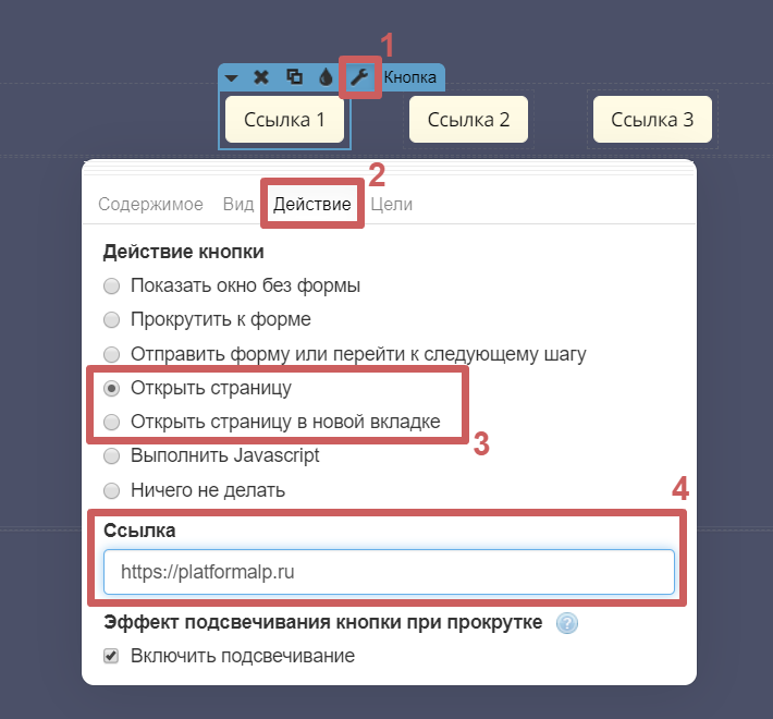 В настройках**** виджета кнопки****(Гаечный ключ), во вкладке «Действие » нужно выбрать «Открыть страницу » или «Открыть страницу в новой вкладке ».