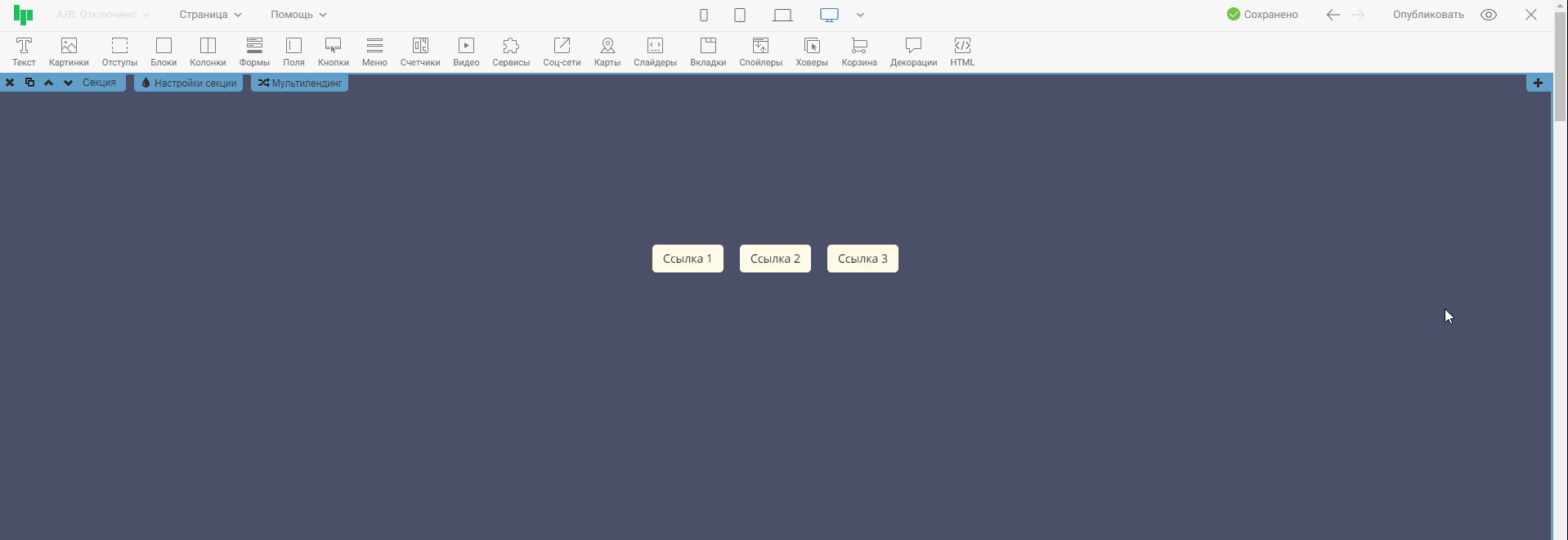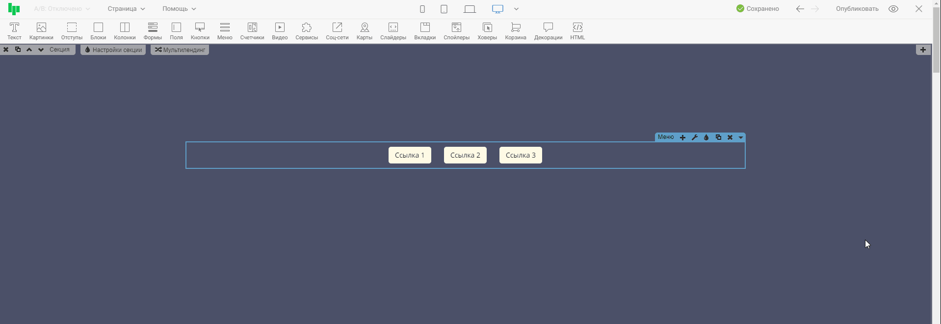 С помощью меню можно организовать навигацию между страницами или в рамках одной страницы. Для этого мы можем добавить уже готовую секцию или виджет «Меню» на страницу или собрать кнопки для переходов вручную.