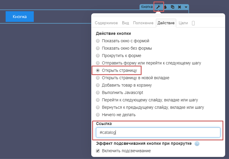 В строке для ввода ссылки прописываем имя якоря, но с решеткой в начале, например, #catalog (тот якорь, который добавили на секцию в первом шаге).