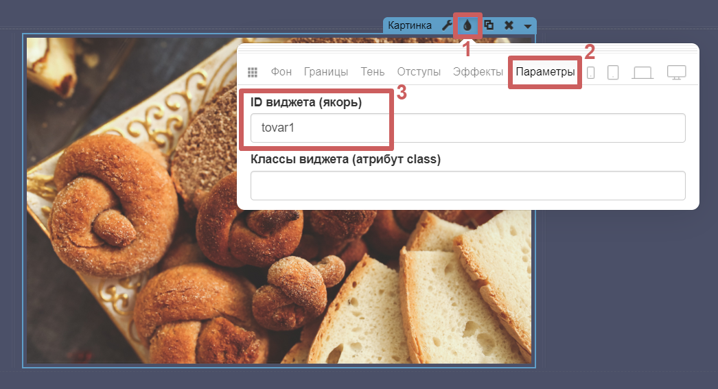 ➢Шаг 1. Заходим в настройки секции (иконка капельки). В разделе «Параметры » указываем желаемый ID секции (якорь). Можно указать любое сочетание русских/английских букв и цифр без использования пробелов. Например, для секции с каталогом товара установим якорь с названием catalog