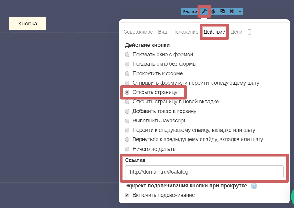 В настройках виджета «Кнопка » ( гаечный ключ ) во вкладке «Действие », выберите «Открыть страницу ».