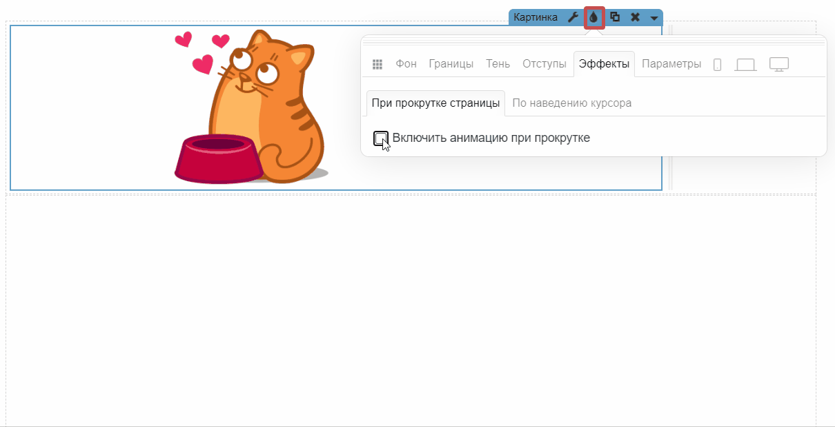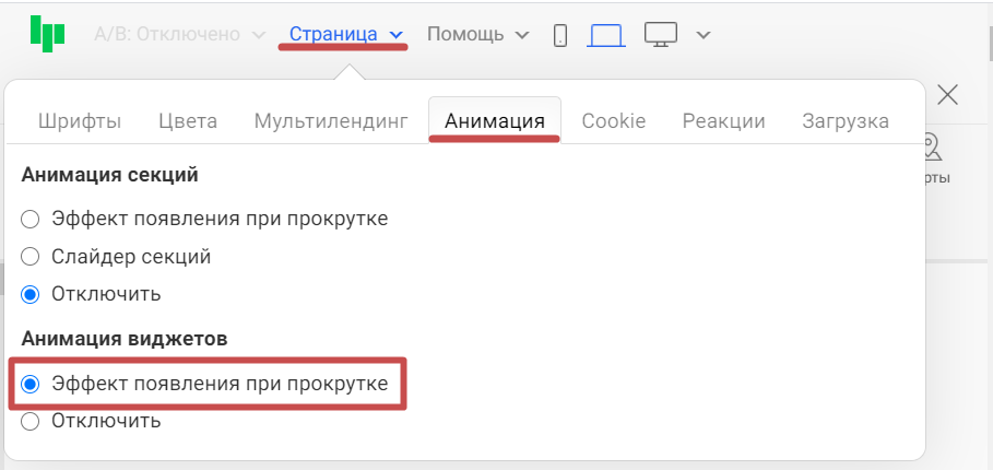 📝Важно! Анимация при прокрутке работает, если в настройках редактора «Страница» активна функция «Эффект появления при прокрутке »: