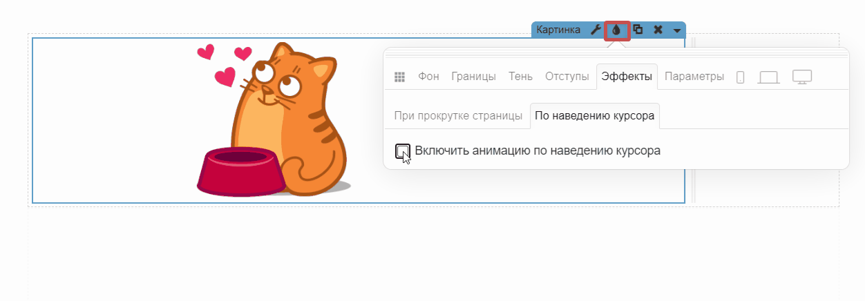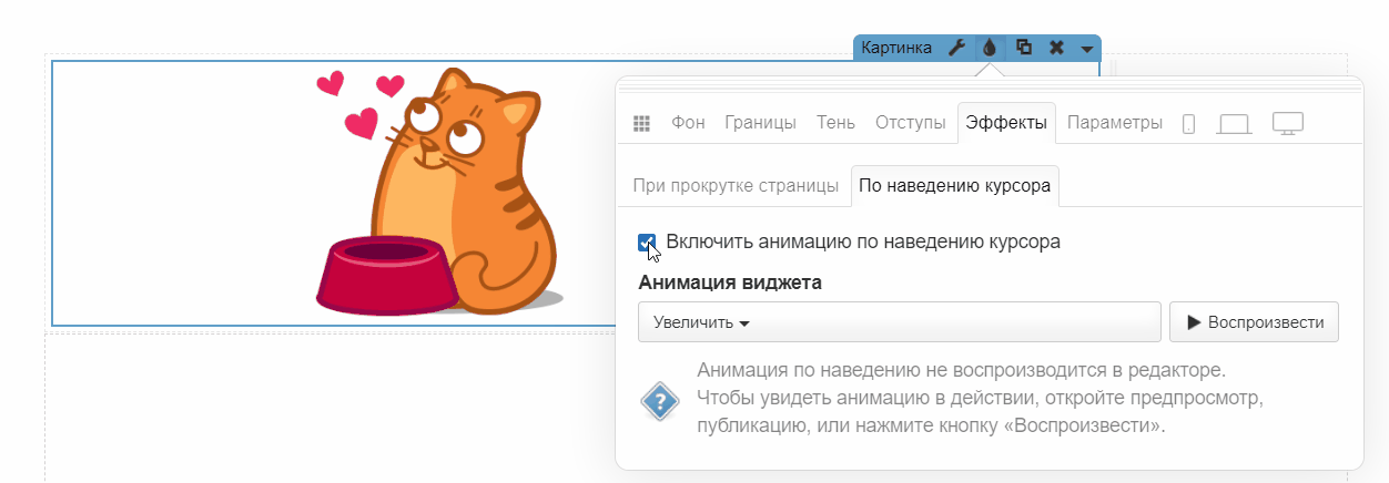 📝Важно! Анимация по наведению не воспроизводится в редакторе. Чтобы увидеть анимацию в действии, откройте предпросмотр , публикацию или нажмите на кнопку «Воспроизвести » справа от выпадающего списка эффектов.