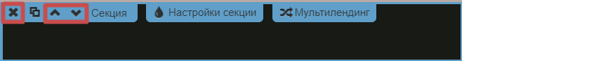 Переместить и удалить секцию можно, соответственно, кликом по стрелочкам и крестику на панели в левом верхнем углу.
