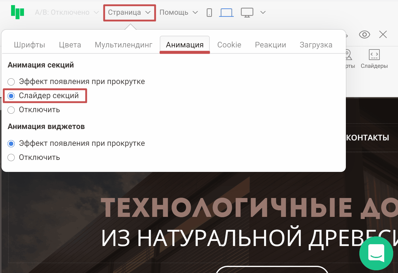 Для этого в редакторе перейдём в раздел «Страницы » во вкладку «Анимация » и активируем эффект «Слайдер секций ».
