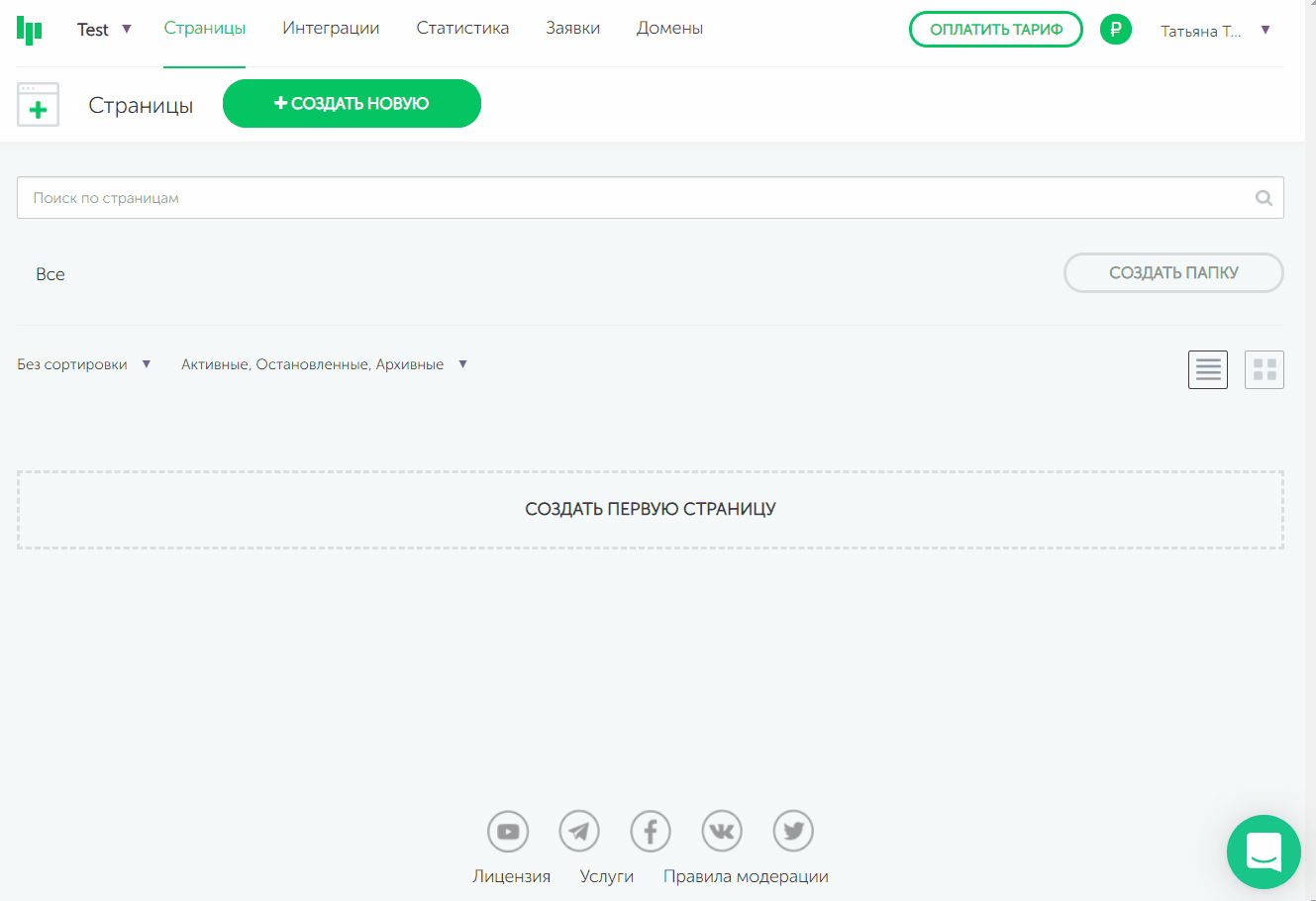 Шаг 1. Добавим в аккаунт новую страницу в разделе «Создание новой страницы» и выберем нужный нам шаблон.