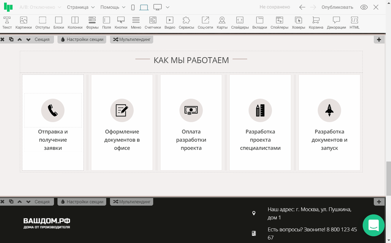Мы изменили эффект отображения секций, и на опубликованной странице они перелистываются как слайды.