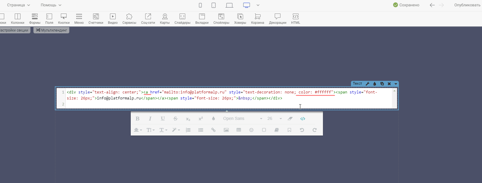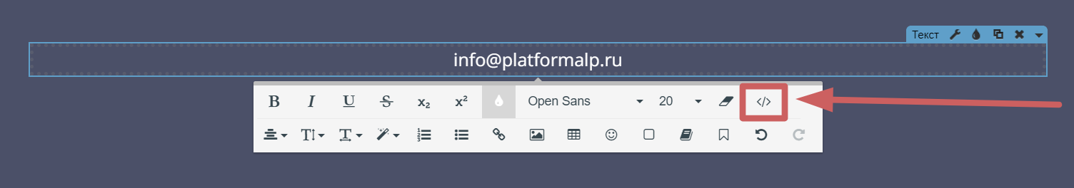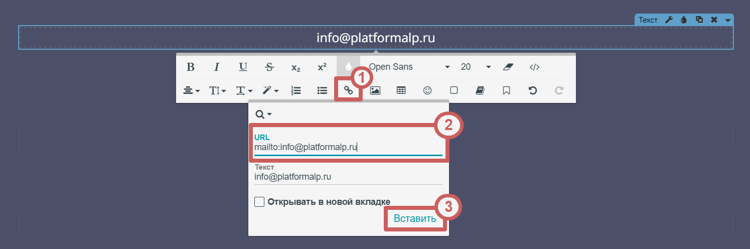 Шаг 2. Выделим наш текст в режиме редактирования и установим на него ссылку в виде: mailto:info@platformalp.ru**** в поле**** «URL ».