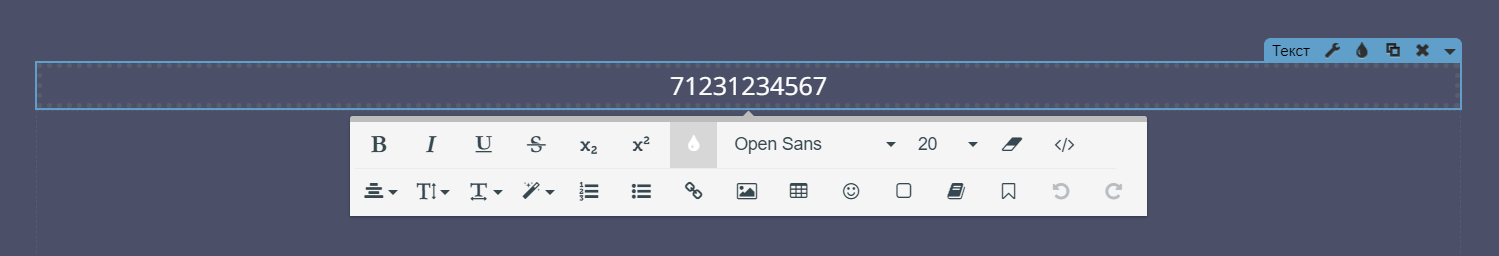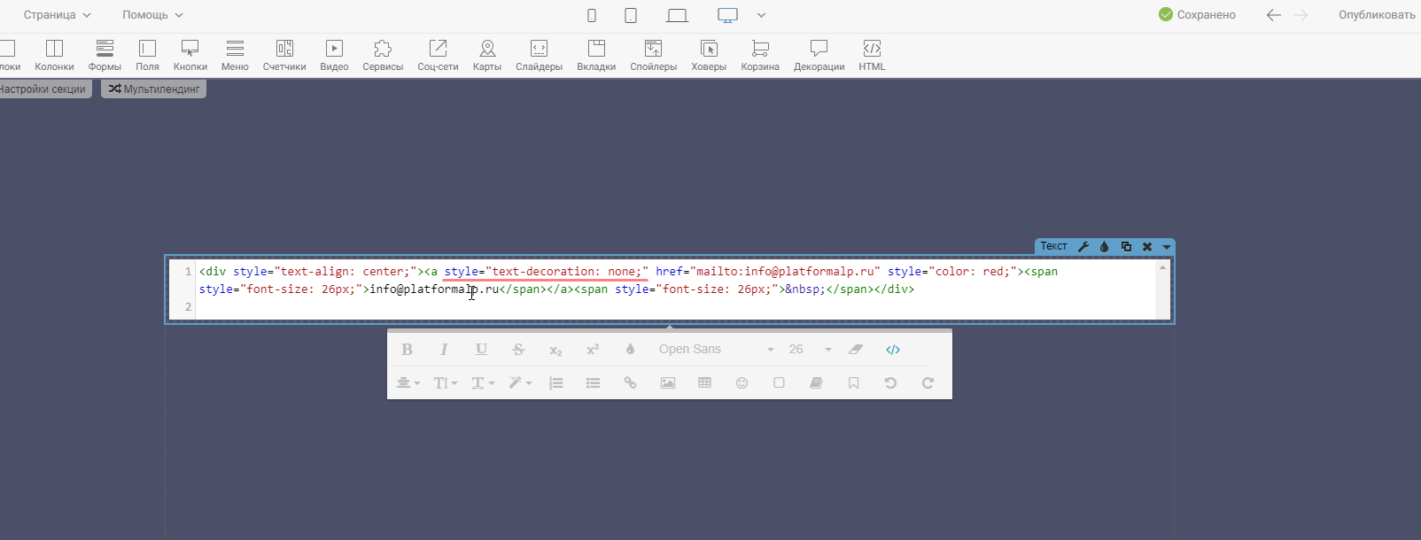 Далее, внутри виджета текста, укажем наш электронный адрес, который будут видеть посетители (можно указать в любом формате).