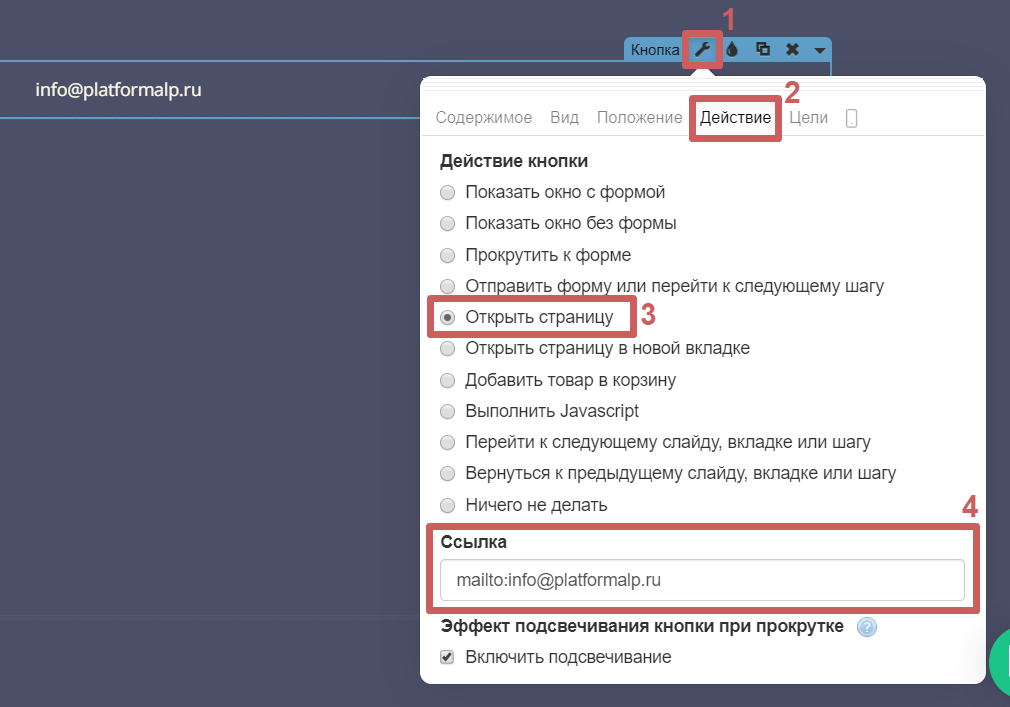 Шаг 4. Переходим в раздел «Действие », выбираем действие «Открыть страницу » и пропишем код в поле «Ссылка ».