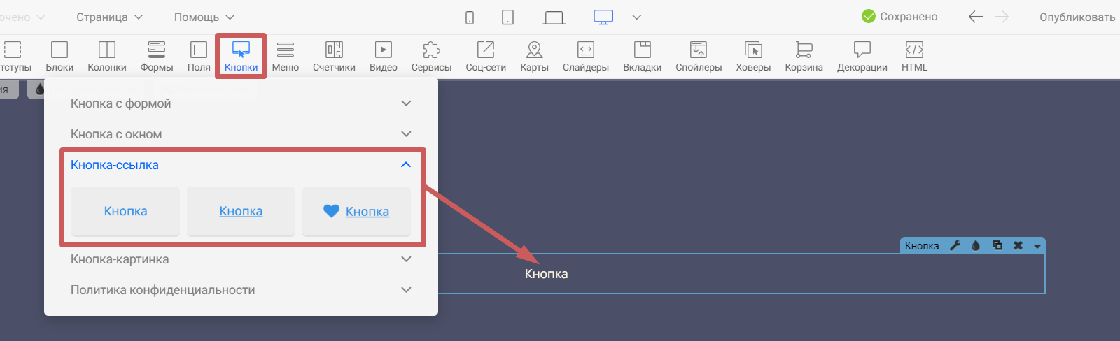 Шаг 1. Добавим виджет «Кнопка » на страницу. Если хотите чтобы кнопка выглядела как обычный текст - воспользуйтесь виджетом «Кнопка-ссылка ».