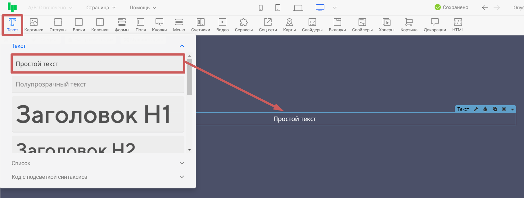Шаг 1. Добавим виджет «Текст » на секцию