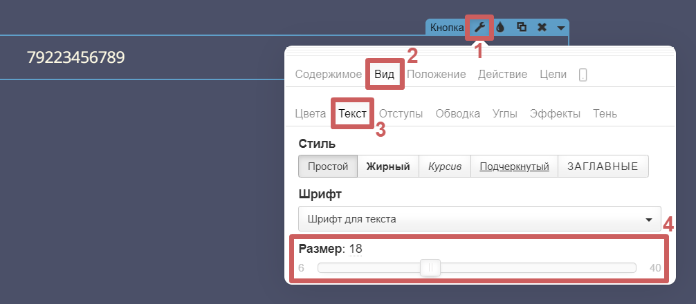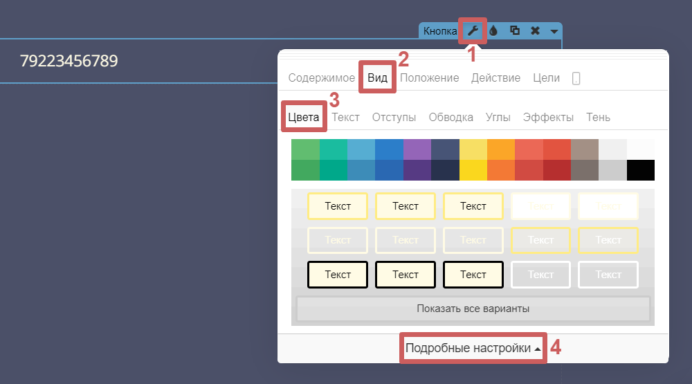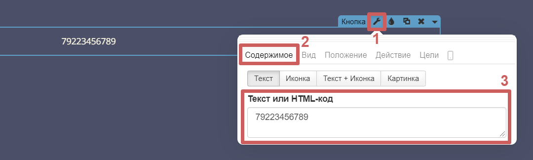 Шаг 2. Перейдём в настройки виджета кнопки (гаечный ключ), в раздел «Содержимое » и укажем наш номер телефона, который будут видеть посетители (можно указать в любом формате).