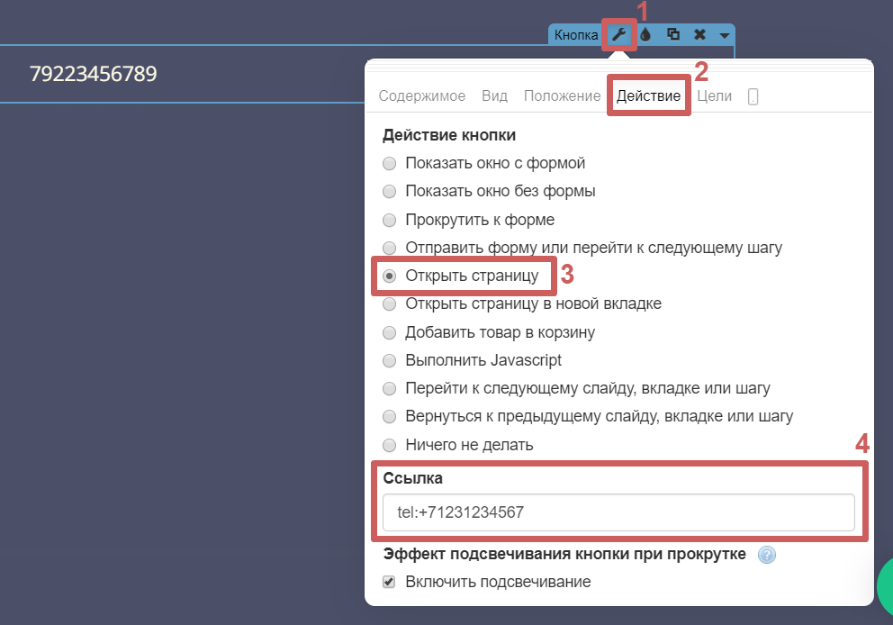 Шаг 4. Переходим в раздел «Действие », выбираем действие «Открыть страницу » и пропишем код телефона в поле «Ссылка ».