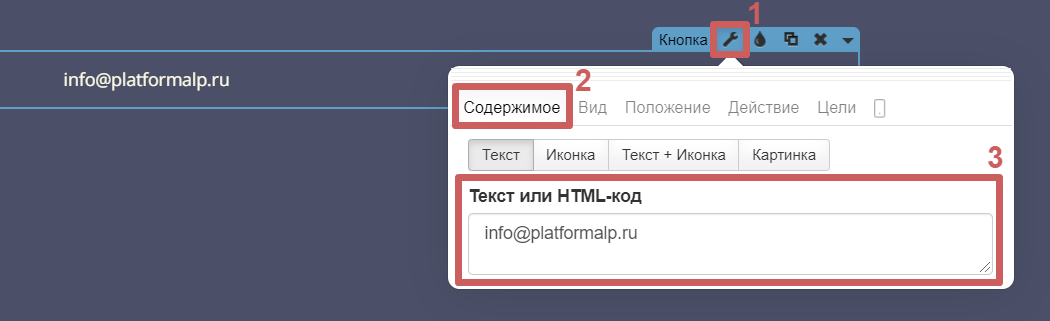 Шаг 2. Перейдём в настройки виджета кнопки (гаечный ключ), в раздел «Содержимое » и укажем наш электронный адрес, который будут видеть посетители (можно указать в любом формате).