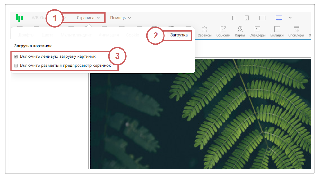 Шаг 1. В редакторе страницы переходим в раздел «Страница » во вкладку «Загрузка ».