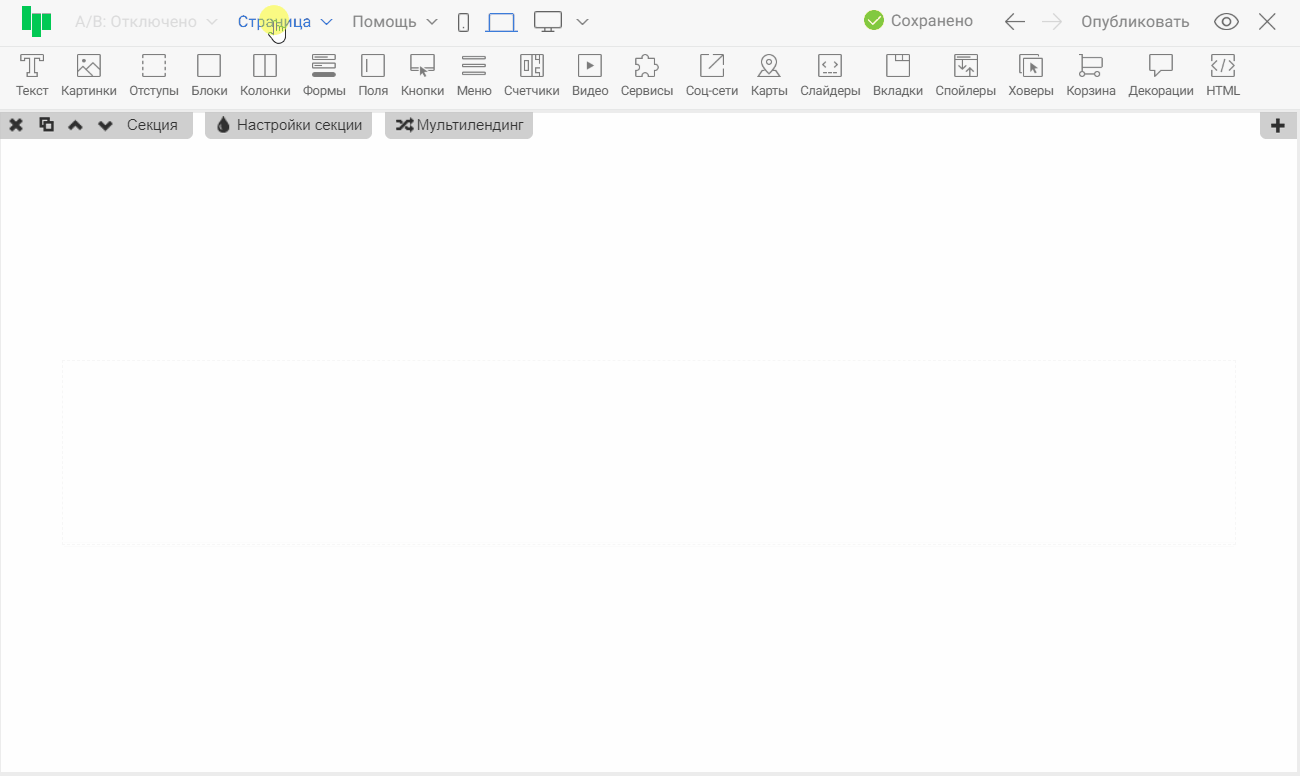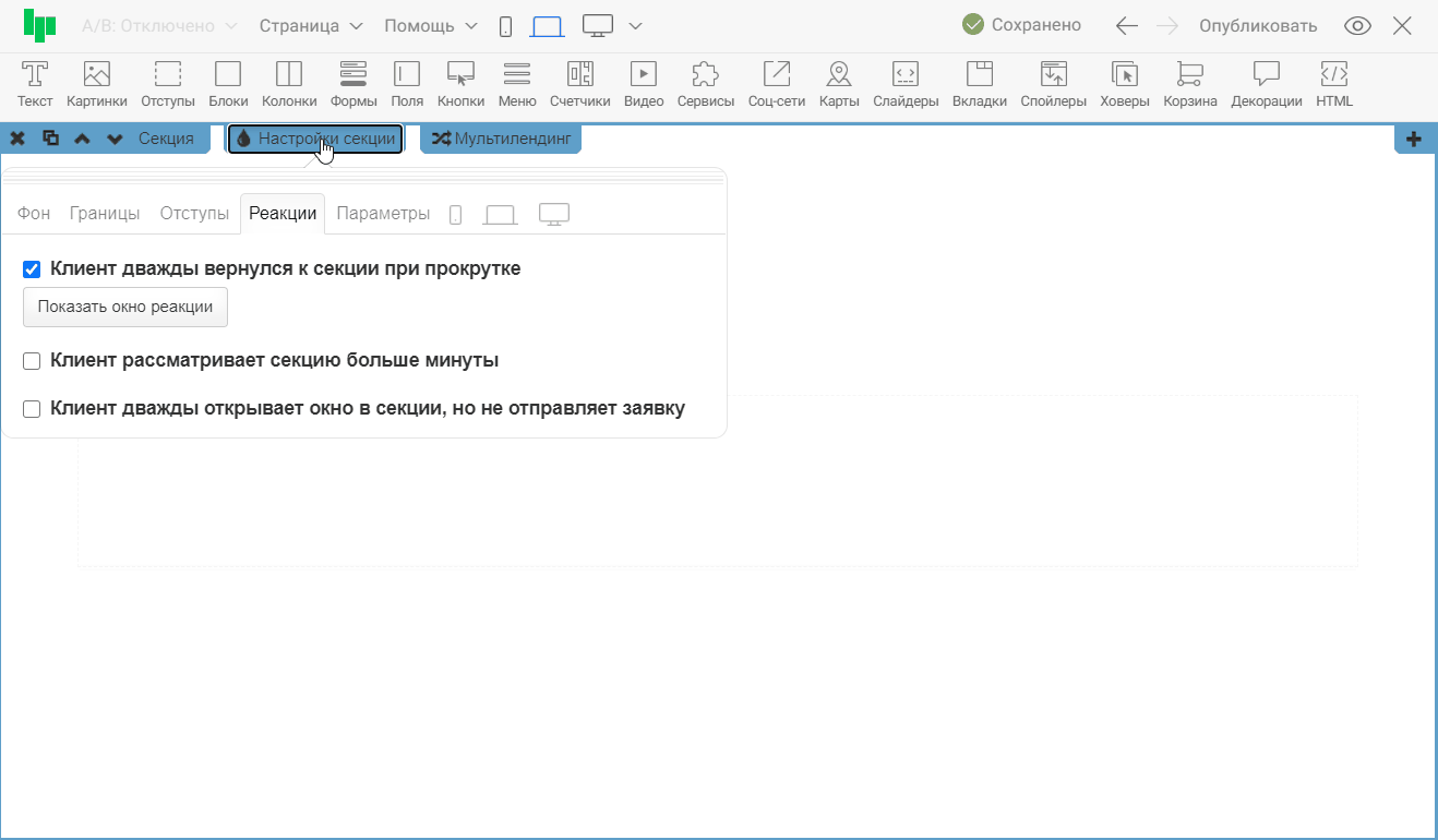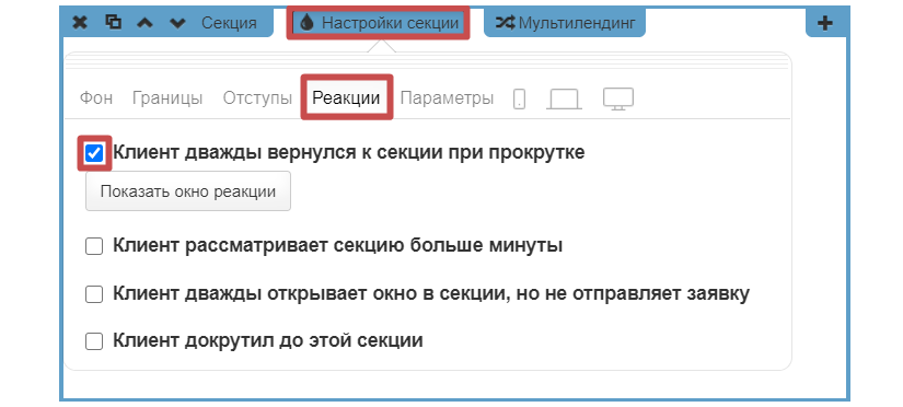 Добавим реакцию для определённой секции в «Настройках секции » во вкладке «Реакции ». Доступны следующие варианты реакций для секций: