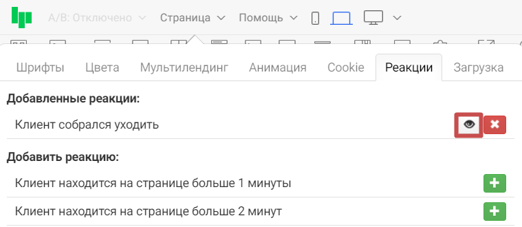 Добавим ее в редакторе в разделе «Страница » во вкладке «Реакции », нажав на зеленую кнопку «+».
