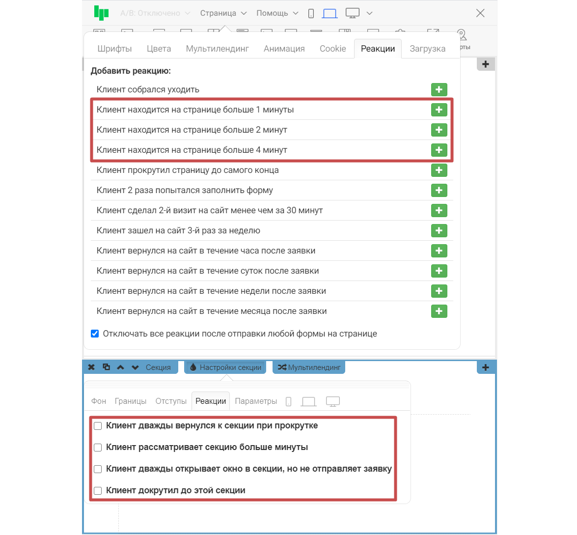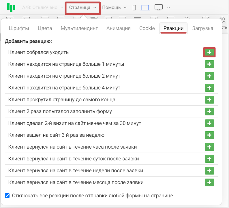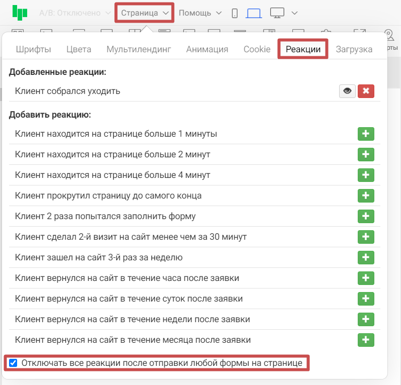 Если нужно отключить показ реакций после того, как клиент уже заполнил и отправил форму на странице, мы можем поставить галочку напротив пункта «Отключать все реакции после отправки формы ». Она находится внизу панели настроек реакций.