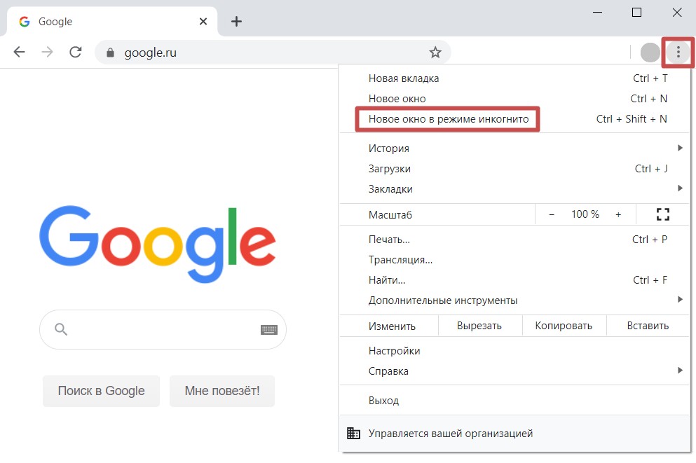 Чтобы проверить работу повторно, перейдите в режим инкогнито. Например, в браузере Chrome этот пункт можно найти в меню, под крестиком: