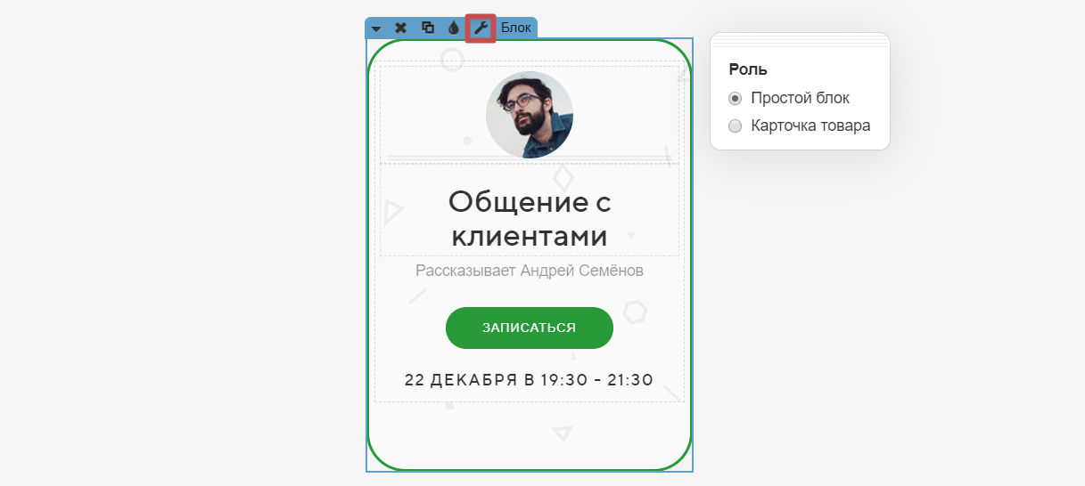 Клик по иконке «Гаечный ключ » открывает настройки типа блока: на выбор можно установить «Обычный блок» или «Карточка товара», если вы настраиваете блоки для интернет-магазина.