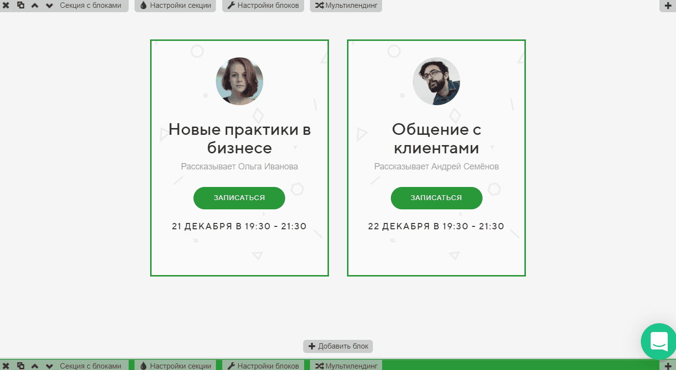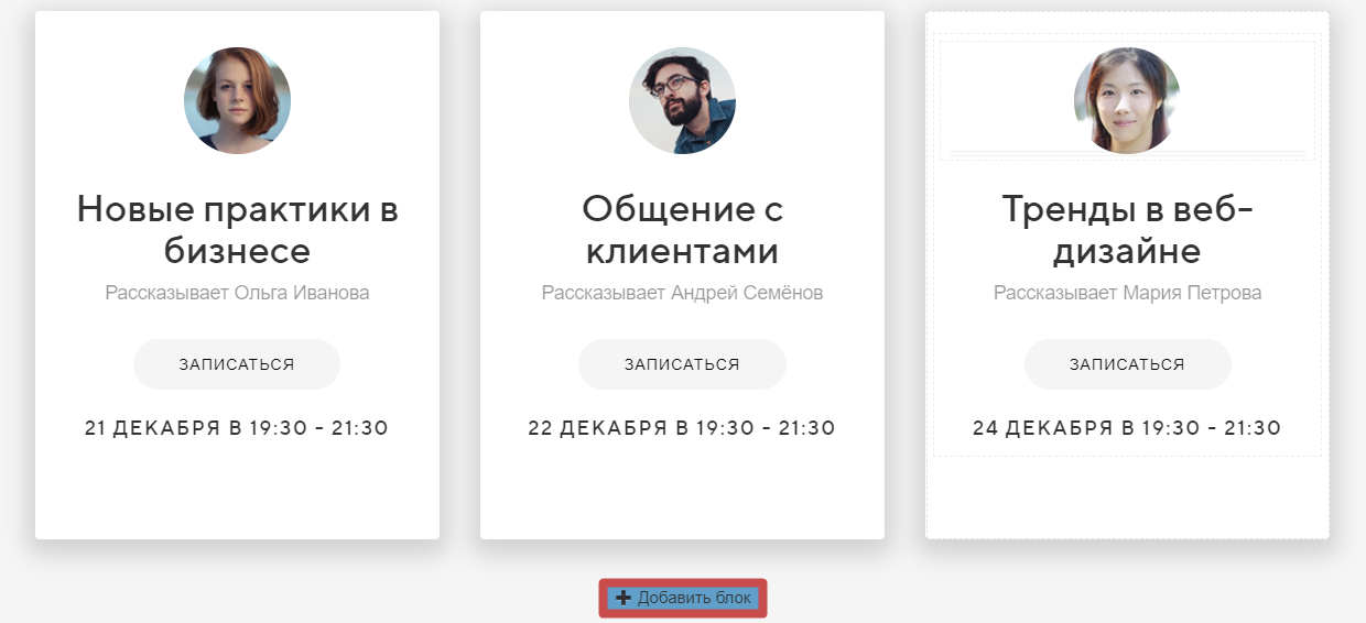 Шаг 3. Добавим еще блок, нажав на кнопку «Добавить блок » внизу секции. Создастся копия последнего блока и добавится в конец.