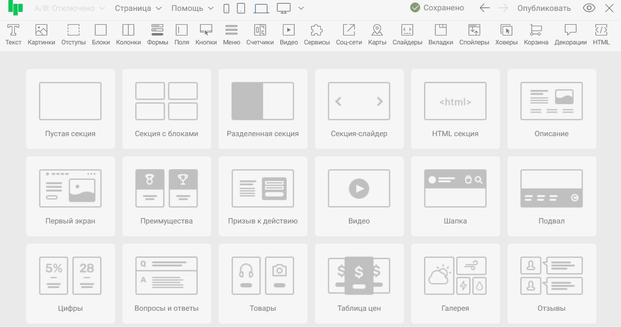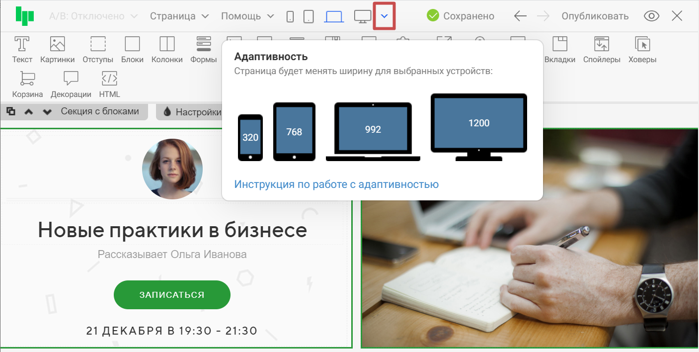 О том, что такое адаптивность и как ее настраивать для всех основных виджетов и секций редактора, можно узнать в статье «Kак настроить адаптивность?». Настройки адаптивности только секции «Набор блоков» рассмотрим ниже.