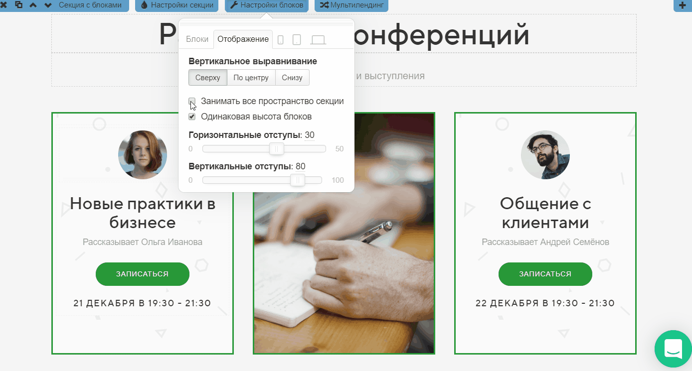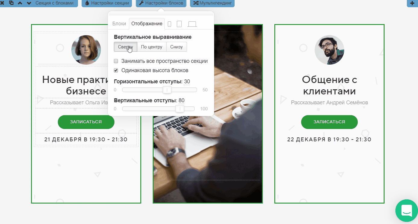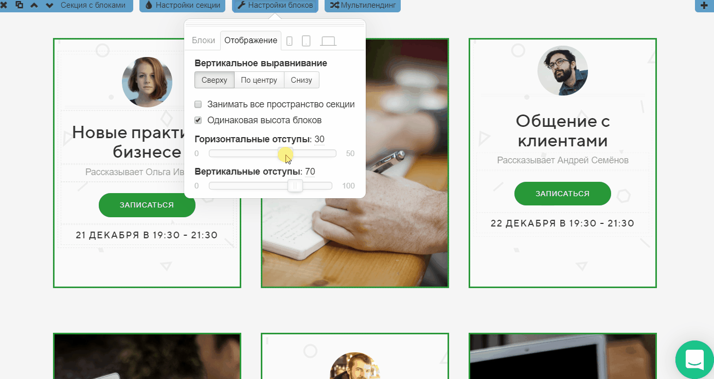 ИзменимГоризонтальные и Вертикальные отступы между блоками в секции.